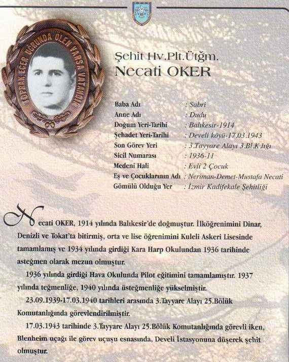 Özgeçmiş: Şehit Hv.Plt. Ütğm. Necati OKER 1914 yılında Balıkesir'de doğmuştur. İlköğrenimini Dinar, Denizli ve Tokat'ta bitirmiş, orta ve lise öğrenimini Kuleli Askeri Lisesinde tamamlamış ve 1934 yılında girdiği Kara Harp Okulundan 1936 tarihinde asteğmen olarak mezun olmuştur. 1936 yılında girdiği Hava Okulunda Pilot eğitimini tamamlamıştır. 1937 yılında teğmenliğe, 1940 yılında üsteğmenliğe yükselmiştir. 23.09.1939-17.03.1940 tarihleri arasında 3.Tayyare Alayı 25.Bölük Komutanlığında görevlendirilmiştir.