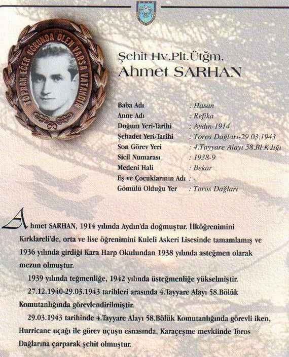 Özgeçmiş: Şehit Hv.Plt. Ütğm. Ahmet SARHAN 1914 yılında Aydın'da doğmuştur. İlköğrenimini Kırklareli'de, orta ve lise öğrenimini Kuleli Askeri Lisesinde tamamlamış ve 1936 yılında girdiği Kara Harp Okulundan 1938 yılında asteğmen olarak mezun olmuştur. 1939 yılında teğmenliğe, 1942 yılında üsteğmenliğe yükselmiştir. 27.12.1940-29.03.1943 tarihleri arasında 4. Tayyare Alayı 58.Bölük Komutanlığında görevlendirilmiştir.