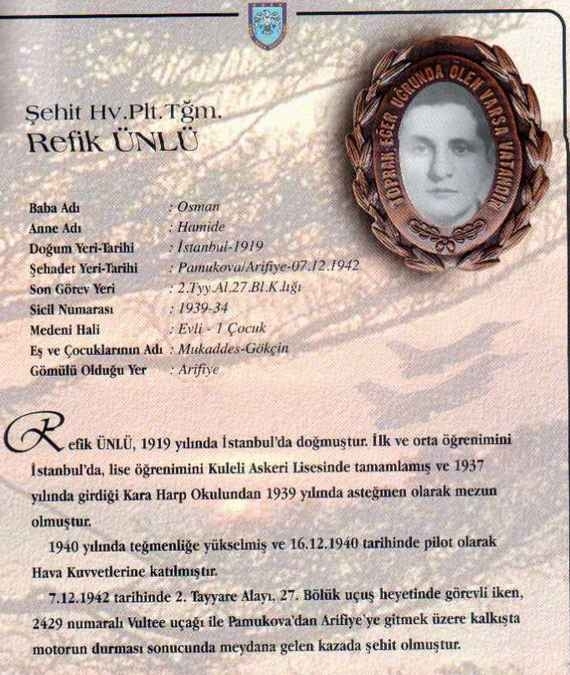 Özgeçmiş: Şehit Hv.Plt. Tğm. Refik ÜNLÜ, 1919 yılında İstanbul'da doğmuştur. İlk ve orta öğrenimini Istanbul'da, lise öğrenimini Kuleli Askeri Lisesinde tamamlamış ve 1937 yılında girdiği Kara Harp Okulundan 1939 yılında asteğmen olarak mezun olmuştur. 1940 yılında teğmenliğe yükselmiş ve 16.12.1940 tarihinde pilot olarak Hava Kuvvetlerine katılmıştır.