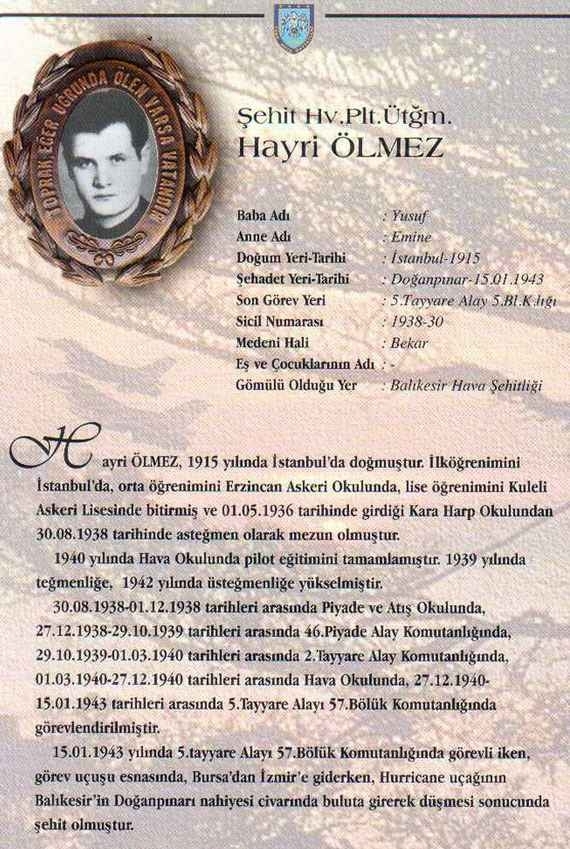 Özgeçmiş: Şehit Hv.Plt. Ütğm. Hayri ÖLMEZ 1915 yılında İstanbul'da doğmuştur. İlköğrenimini İstanbul'da, orta öğrenimini Erzincan Askeri Okulunda, lise öğrenimini Kuleli Askeri Lisesinde bitirmiş ve 01.05.1936 tarihinde girdiği Kara Harp Okulundan 30.08.1938 tarihinde asteğmen olarak mezun olmuştur. 1940 yılında Hava Okulunda pilot eğitimini tamamlamıştır. 1939 yılında teğmenliğe, 1942 yılında üsteğmenliğe yükselmiştir. 30.08.1938-01.12.1938 tarihleri arasında Piyade ve Atış Okulunda, 27.12.1938-29.10.1939 tarihleri arasında 46.Piyade Alay Komutanlığında, 29.10.1939-01.03.1940 tarihleri arasında 2.Tayyare Alay Komutanlığında, 01.03.1940-27.12.1940 tarihleri arasında Hava Okulunda, 27.12.1940- 15.01.1943 tarihleri arasında 5.Tayyare Alayı 57.Bölük Komutanlığında görevlendirilmiştir.