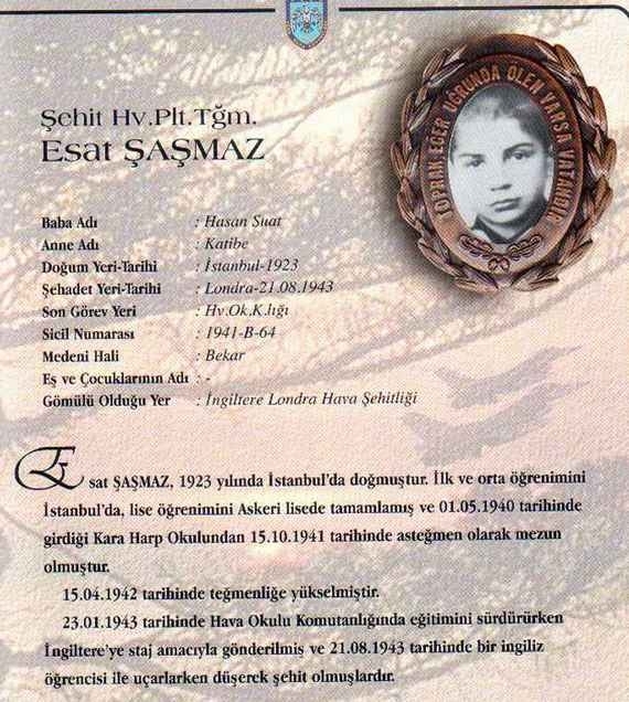 Özgeçmiş: Şehit Hv.Plt. Tğm. Esat ŞAŞMAZ 1923 yılında İstanbul'da doğmuştur. İlk ve orta öğrenimini Istanbul'da, lise öğrenimini Askeri lisede tamamlamış ve 01.05.1940 tarihinde girdiği Kara Harp Okulundan 15.10.1941 tarihinde asteğmen olarak mezun olmuştur. 15.04.1942 tarihinde teğmenliğe yükselmiştir.