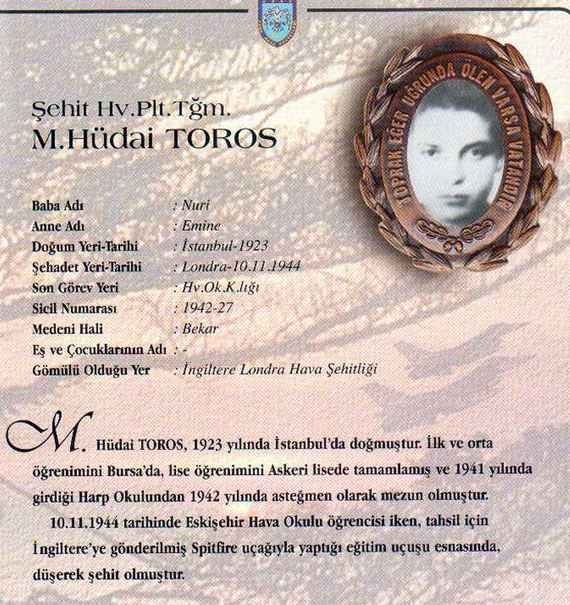 Özgeçmiş: Şehit Hv.Plt. Tğm. M.Hüdai TOROS 1923 yılında İstanbul'da doğmuştur. İlk ve orta öğrenimini Bursa'da, lise öğrenimini Askeri lisede tamamlamış ve 1941 yılında girdiği Harp Okulundan 1942 yılında asteğmen olarak mezun olmuştur.