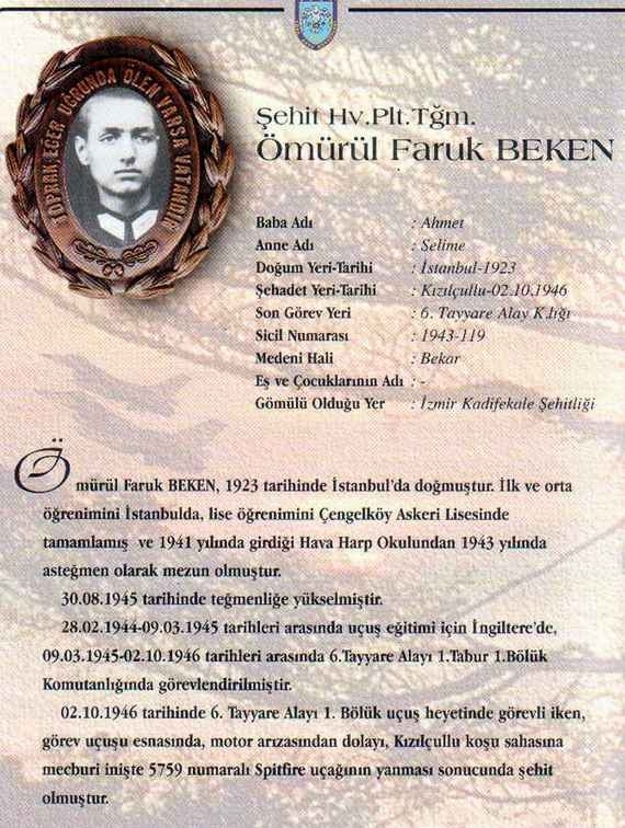 Özgeçmiş: Şehit Hv.Plt. Tğm. Ömürül Faruk BEKEN 1923 tarihinde İstanbul'da doğmuştur. İlk ve orta öğrenimini İstanbulda, lise öğrenimini Çengelköy Askeri Lisesinde tamamlamış ve 1941 yılında girdiği Hava Harp Okulundan 1943 yılında asteğmen olarak mezun olmuştur. 30.08.1945 tarihinde teğmenliğe yükselmiştir. 28.02.1944-09.03.1945 tarihleri arasında uçuş eğitimi için İngiltere'de, 09.03.1945-02.10.1946 tarihleri arasında 6. Tayyare Alayı 1.Tabur 1.Bölük Komutanlığında görevlendirilmiştir.