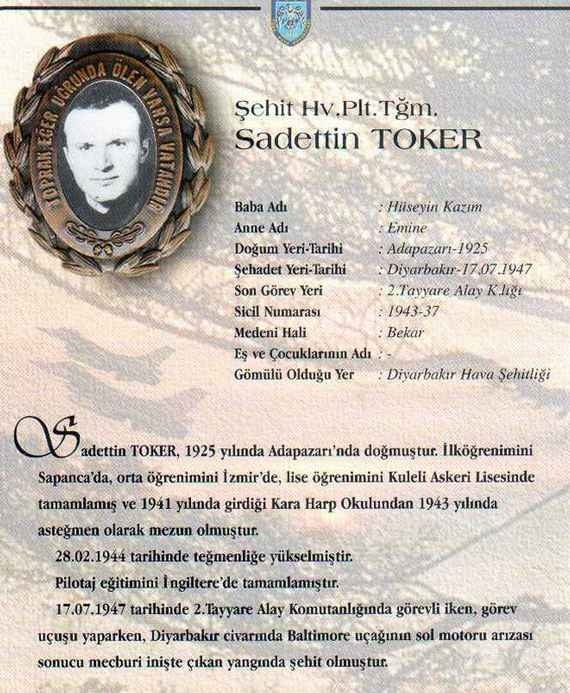 Özgeçmiş: Şehit Hv.Plt. Tğm. Sadettin TOKER 1925 yılında Adapazarı'nda doğmuştur. İlköğrenimini Sapanca'da, orta öğrenimini İzmir'de, lise öğrenimini Kuleli Askeri Lisesinde tamamlamış ve 1941 yılında girdiği Kara Harp Okulundan 1943 yılında asteğmen olarak mezun olmuştur. 28.02.1944 tarihinde teğmenliğe yükselmiştir. Pilotaj eğitimini İngiltere'de tamamlamıştır.