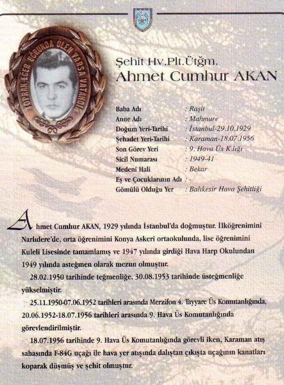 Özgeçmiş: Şehit Hv.Plt.Ütğm. A. Cumhur Akan 1929 yılında İstanbul'da doğmuştur. İlköğrenimini Narlıdere'de, orta öğrenimini Konya Askeri ortaokulunda, lise öğrenimini Kuleli Lisesinde tamamlamış ve 1947 yılında girdiği Hava Harp Okulundan 1949 yılında asteğmen olarak mezun olmuştur. 28.02.1950 tarihinde teğmenliğe, 30.08.1953 tarihinde üsteğmenliğe yükselmiştir.