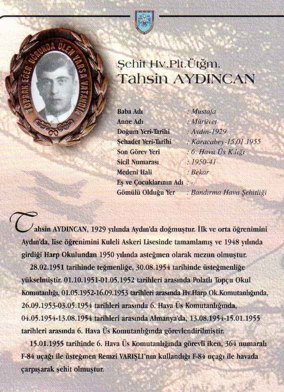 Özgeçmiş: Şehit Hv.Plt. Ütğm. Tahsin AYDINCAN 1929 yılında Aydın'da doğmuştur. İlk ve orta öğrenimini Aydın'da, lise öğrenimini Kuleli Askeri Lisesinde tamamlamış ve 1948 yılında girdiği Harp Okulundan 1950 yılında asteğmen olarak mezun olmuştur. 28.02.1951 tarihinde teğmenliğe, 30.08.1954 tarihinde üsteğmenliğe yükselmiştir. 01.10.1951-01.05.1952 tarihleri arasında Polatlı Topçu Okul Komutanlığı, 01.05.1952-16.09.1953 tarihleri arasında Hv.Harp Ok.Komutanlığında, 26.09.1953-03.05.1954 tarihleri arasında 6. Hava Üs Komutanlığında, 04.05.1954-13.08.1954 tarihleri arasında Almanya'da, 13.08.1954-15.01.1955 tarihleri arasında 6. Hava Üs Komutanlığında görevlendirilmiştir.