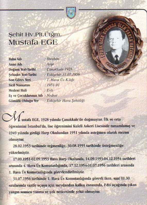 Özgeçmiş: Şehit Hv.Plt.Ütğm. Mustafa Ege 1928 yılında Çanakkale'de doğmuştur. İlk ve orta öğrenimini İstanbul'da, lise öğrenimini Kuleli Askeri Lisesinde tamamlamış ve 1949 yılında girdiği Harp Okulundan 1951 yılında asteğmen olarak mezun olmuştur. 28.02.1953 tarihinde teğmenlige, 30.08.1955 tarihinde üsteğmenlige yükselmiştir.