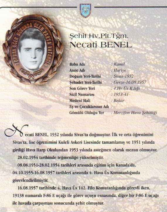 Özgeçmiş: Şehit Hv.Plt.Tğm. Necati Benel 1932 yılında Sivas'ta doğmuştur. İlk ve orta öğrenimini Sivas'ta, lise öğrenimini Kuleli Askeri Lisesinde tamamlamış ve 1951 yılında girdiği Hava Harp Okulundan 1953 yılında asteğmen olarak mezun olmuştur. 28.02.1954 tarihinde teğmenliğe yükselmiştir. 08.08.1951-28.02.1954 tarihleri arasında eğitim için Kanada'da, 04.10.1955-16.08.1957 tarihleri arasında 4. Hava Üs Komutanlığında görevlendirilmiştir.