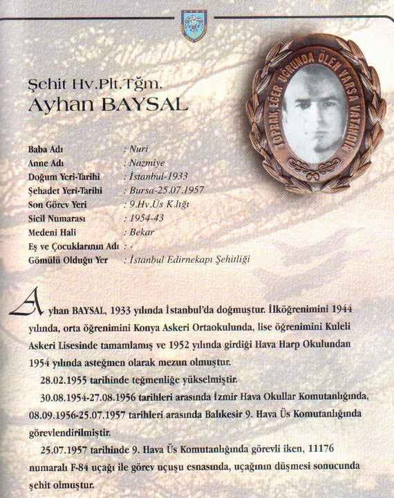 Özgeçmiş: Şehit Hv.Plt.Tğm. Ayhan Baysal 1933 yılında İstanbul'da doğmuştur. İlköğrenimini 1944 yılında, orta öğrenimini Konya Askeri Ortaokulunda, lise öğrenimini Kuleli Askeri Lisesinde tamamlamış ve 1952 yılında girdiği Hava Harp Okulundan 1954 yılında asteğmen olarak mezun olmuştur. 28.02.1955 tarihinde teğmenliğe yükselmiştir. 30.08.1954-27.08.1956 tarihleri arasında İzmir Hava Okullar Komutanlığında, 08.09.1956-25.07.1957 tarihleri arasında Balıkesir 9. Hava Üs Komutanlığında görevlendirilmiştir.