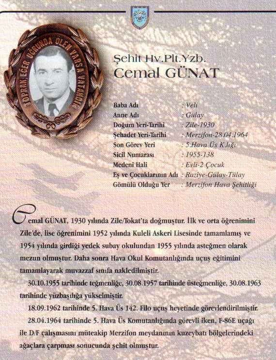 Özgeçmiş: Şehit Hv.Plt.Yzb. Cemal Günat 1930 yılında Zile/Tokat'ta doğmuştur. İlk ve orta öğrenimini Zile'de, lise öğrenimini 1952 yılında Kuleli Askeri Lisesinde tamamlamış ve 1954 yılında girdiği yedek subay okulundan 1955 yılında asteğmen olarak mezun olmuştur. Daha sonra Hava Okul Komutanlığında uçuş eğitimini tamamlayarak muvazzaf sınıfa nakledilmiştir.
