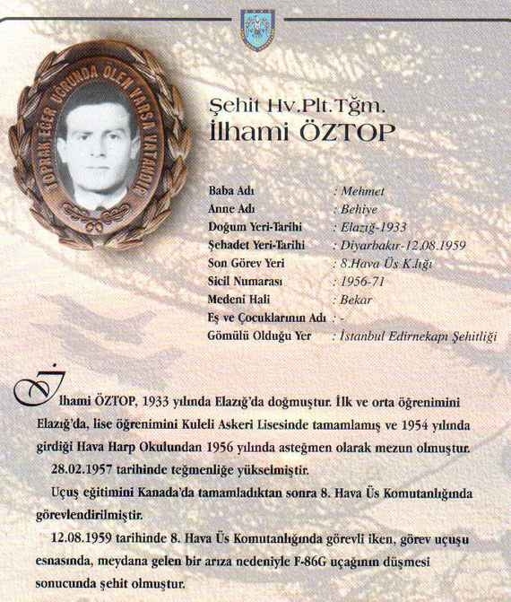 Özgeçmiş: Şehit Hv.Plt.Tğm. İlhami Öztop 1933 yılında Elazığ'da doğmuştur. İlk ve orta öğrenimini Elazığ'da, lise öğrenimini Kuleli Askeri Lisesinde tamamlamış ve 1954 yılında girdiği Hava Harp Okulundan 1956 yılında asteğmen olarak mezun olmuştur. 28.02.1957 tarihinde teğmenliğe yükselmiştir. Uçuş eğitimini Kanada'da tamamladıktan sonra 8. Hava Üs Komutanlığında görevlendirilmiştir.