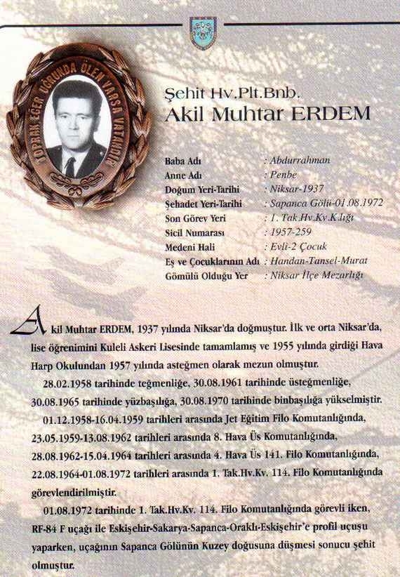 Özgeçmiş: Şehit Hv.Plt.Bnb. Akil Muhtar Erdem 1937 yılında Niksar'da doğmuştur. İlk ve orta Niksar'da, lise öğrenimini Kuleli Askeri Lisesinde tamamlamış ve 1955 yılında girdiği Hava Harp Okulundan 1957 yılında asteğmen olarak mezun olmuştur.