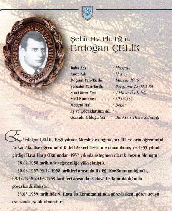 Özgeçmiş: Şehit Hv.Plt.Tğm. Erdoğan Çelik 1935 yılında Mersin'de doğmuştur. İlk ve orta öğrenimini Ankara'da, lise öğrenimini Kuleli Askeri Lisesinde tamamlamış ve 1955 yılında girdiği Hava Harp Okulundan 1957 yılında asteğmen olarak mezun olmuştur. 28.02.1958 tarihinde teğmenliğe yükselmiştir. 30.08.1957-05.12.1958 tarihleri arasında Hv.Eğt.Kor.Komutanlığında, 08.12.1958-23.03.1959 tarihleri arasında 9. Hava Üs Komutanlığında görevlendirilmiştir.