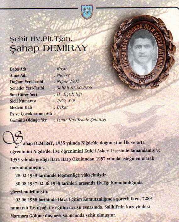 Özgeçmiş: Şehit Hv.Plt.Tğm. Şahap Demiray 1935 yılında Niğde'de doğmuştur. İlk ve orta öğrenimini Niğde'de, lise öğrenimini Kuleli Askeri Lisesinde tamamlamış ve 1955 yılında girdiği Hava Harp Okulundan 1957 yılında asteğmen olarak mezun olmuştur.