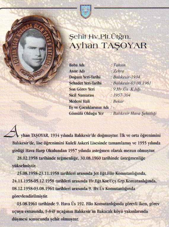Özgeçmiş: Şehit Hv.Plt.Ütğm. Ayhan Taşoyar 1934 yılında Balıkesir'de doğmuştur. İlk ve orta öğrenimini Balıkesir'de, lise öğrenimini Kuleli Askeri Lisesinde tamamlamış ve 1955 yılında girdiği Hava Harp Okulundan 1957 yılında asteğmen olarak mezun olmuştur.