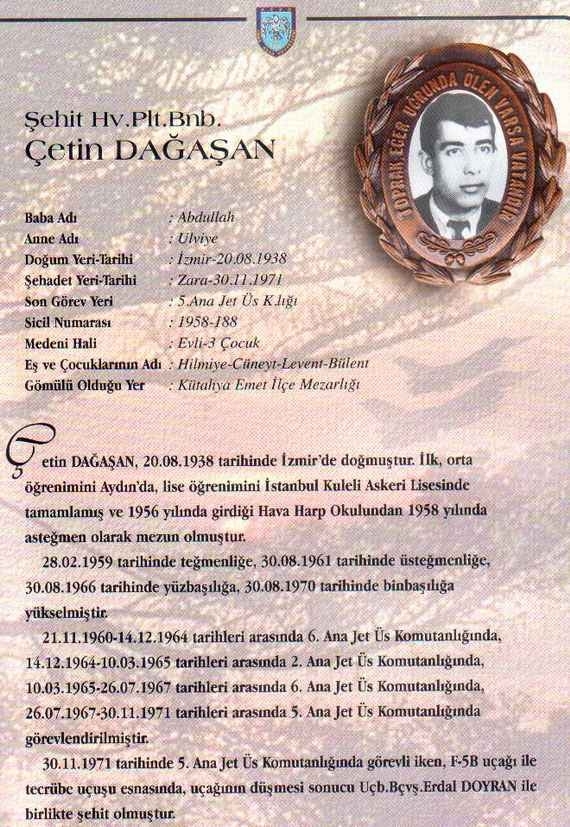 Özgeçmiş: Şehit Hv.Plt.Bnb. Çetin Dağaşan 20.08.1938 tarihinde İzmir'de doğmuştur. İlk, orta öğrenimini Aydın'da, lise öğrenimini İstanbul Kuleli Askeri Lisesinde tamamlamış ve 1956 yılında girdiği Hava Harp Okulundan 1958 yılında asteğmen olarak mezun olmuştur. 28.02.1959 tarihinde teğmenliğe, 30.08.1961 tarihinde üsteğmenliğe, 30.08.1966 tarihinde yüzbaşılığa, 30.08.1970 tarihinde binbaşılığa yükselmiştir. 21.11.1960-14.12.1964 tarihleri arasında 6. Ana Jet Üs Komutanlığında, 14.12.1964-10.03.1965 tarihleri arasında 2. Ana Jet Üs Komutanlığında, 10.03.1965-26.07.1967 tarihleri arasında 6. Ana Jet Üs Komutanlığında, 26.07.1967-30.11.1971 tarihleri arasında 5. Ana Jet Üs Komutanlığında görevlendirilmiştir.