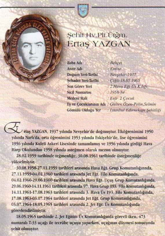 Özgeçmiş: Şehit Hv.Plt.Ütğm. Ertaş Yazgan 1937 yılında Nevşehir'de doğmuştur. İlköğrenimini 1950 yılında Narlı'da, orta öğrenimini 1953 yılında Eskişehir'de, lise öğrenimini 1956 yılında Kuleli Askeri Lisesinde tamamlamış ve 1956 yılında girdiği Hava Harp Okulundan 1958 yılında asteğmen olarak mezun olmuştur.