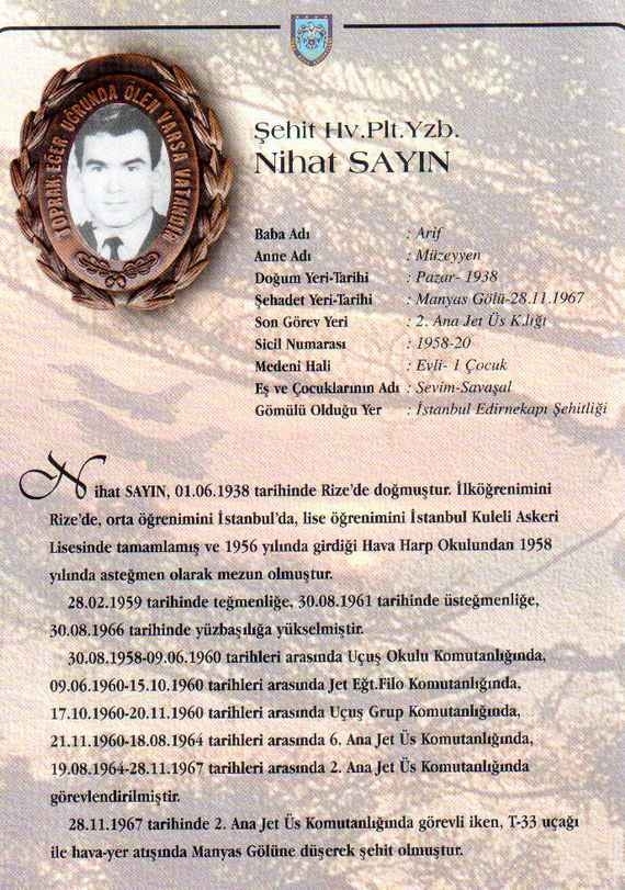 Özgeçmiş: Şehit Hv.Plt.Yzb. Nihat Sayın 01.06.1938 tarihinde Rize'de doğmuştur. İlköğrenimini Rize'de, orta öğrenimini İstanbul'da, lise öğrenimini İstanbul Kuleli Askeri Lisesinde tamamlamış ve 1956 yılında girdiği Hava Harp Okulundan 1958 yılında asteğmen olarak mezun olmuştur. 28.02.1959 tarihinde teğmenliğe, 30.08.1961 tarihinde üsteğmenliğe, 30.08.1966 tarihinde yüzbaşılığa yükselmiştir.