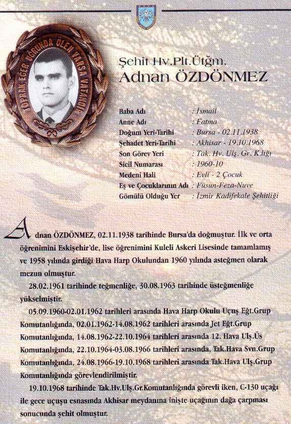 Özgeçmiş: Şehit Hv.Pl.Ütğm. Adnan Özdönmez 02.11.1938 tarihinde Bursa'da doğmuştur. İlk ve orta öğrenimini Eskişehir'de, lise öğrenimini Kuleli Askeri Lisesinde tamamlamış ve 1958 yılında girdiği Hava Harp Okulundan 1960 yılında asteğmen olarak mezun olmuştur. 28.02.1961 tarihinde teğmenliğe, 30.08.1963 tarihinde üsteğmenliğe yükselmiştir.