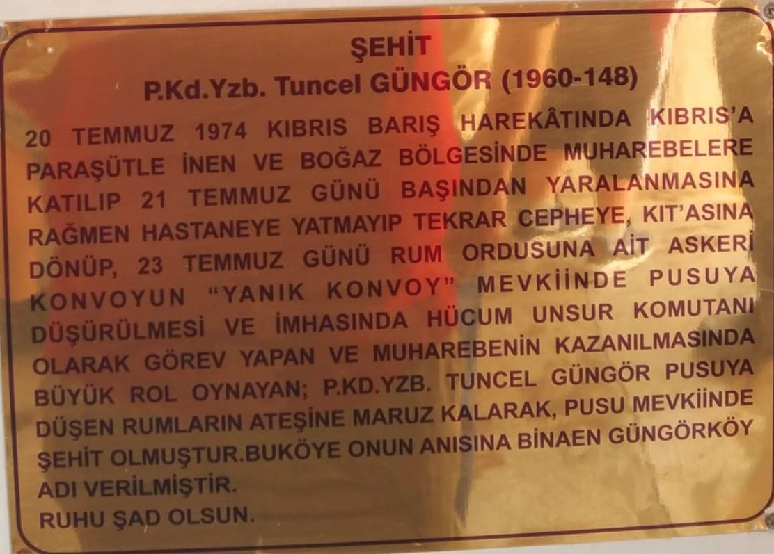 Şehadet Öyküsü: 20 Temmuz 1974 Kıbrıs Bariş harekâtinda Kıbrıs'aparaşütle inen ve boğaz bölgesinde muharebelere katılıp 21 temmuz günü başından yaralanmasına rağmen hastaneye yatmayıp tekrar cepheye, kıt'asina dönüp, 23 temmuz günü Rum ordusuna ait askeri konvoyun "yanık konvoy" mevkiinde pusuya düşürülmesi ve imhasında hücum unsur komutanı olarak görev yapan ve muharebenin kazanılmasinda büyük rol oynayan; P.Kd.Yzb. Tuncel Güngör pusuya düşen rumlarrın ateşine maruz kalarak, pusu mevkiinde şehit olmuştur.