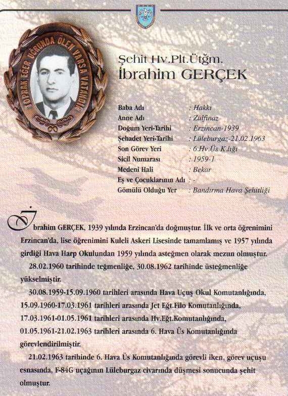 Özgeçmiş: Şehit Hv.Plt.Ütğm. İbrahim Gerçek 1939 yılında Erzincan'da doğmuştur. İlk ve orta öğrenimini Erzincan'da, lise öğrenimini Kuleli Askeri Lisesinde tamamlamış ve 1957 yılında girdiği Hava Harp Okulundan 1959 yılında asteğmen olarak mezun olmuştur. 28.02.1960 tarihinde teğmenliğe, 30.08.1962 tarihinde üsteğmenlige yükselmiştir. 30.08.1959-15.09.1960 tarihleri arasında Hava Uçuş Okul Komutanlığında, 15.09.1960-17.03.1961 tarihleri arasında Jet Eğt.Filo Komutanlığında, 17.03.1961-01.05.1961 tarihleri arasında Hv.Eğt.Komutanlığında, 01.05.1961-21.02.1963 tarihleri arasında 6. Hava Üs Komutanlığında görevlendirilmiştir.