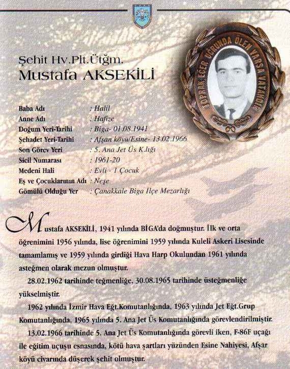 Özgeçmiş: Şehit Hv.Plt.Ütğm. Mustafa Aksekili 1941 yılında BİGA'da doğmuştur. İlk ve orta öğrenimini 1956 yılında, lise öğrenimini 1959 yılında Kuleli Askeri Lisesinde tamamlamış ve 1959 yılında girdiği Hava Harp Okulundan 1961 yılında asteğmen olarak mezun olmuştur. 28.02.1962 tarihinde teğmenliğe, 30.08.1965 tarihinde üsteğmenliğe yükselmiştir.