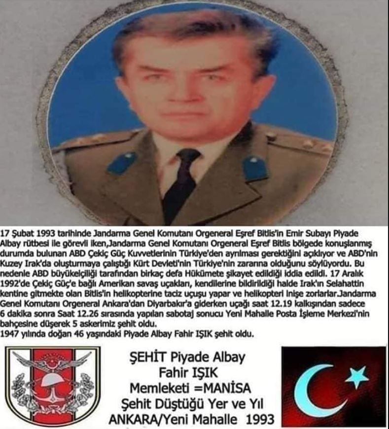 Şehadet Öyküsü: 17.02.1993 tarihinde Jandarma Genel Komutanı Orgeneral Eşref Bitlis'in Emir Subayı Piyade Albay rütbesi ile görevli iken, Jandarma Genel Komutanı Orgeneral Eşref Bitlis bölgede konuşlanmış durumda bulunan ABD Çekiç Güç Kuvvetlerinin Türkiye'den ayrılması gerektiğini açıklıyor ve ABD'nin Kuzey Irak'da oluşturmaya çalıştığı Kürt Devleti'nin Türkiye'nin zaranna olduğunu söylüyordu. Bu nedenle ABD büyükelçiliği tarafından birkaç defa Hükümete şikayet edildiği iddia edildi. 17 Aralık 1992'de Çekiç Güç'e bağlı Amerikan savaş uçaklan, kendilerine bildirildiği halde Irak'ın Selahattin kentine gitmekte olan Bitlis'in helikopterine taciz uçuşu yapar ve helikopteri Inişe zorlarlar. Jandarma Genel Komutanı Orgeneral Eşref Bitlis ile birlikte Ankara'dan Diyarbakır'a giderken uçağı saat 12.19 kalkışından sadece 6 dakika sonra Saat 12.26 sırasında yapılan sabotaj sonucu Yeni Mahalle Posta İşleme Merkezi'nin bahçesine düşerek şehit oldu.