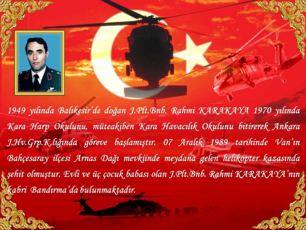 Özgeçmiş: Şehit J.Plt.Kd.Bnb Rahmi Karakaya; 1949 yılında Balıkesir'de doğan J.Plt.Bnb. Rahmi KARAKAYA, 1968 yılında Kuleli Askeri Liseisnden, 1970 yılında Kara Harp Okulundan Jandarma Teğmen olarak Mezun olmasına müteakip Kara Havacılık Okulunu bitirerek Ankara J.Hv.Grp.K.lığında göreve başlamıştır. 0