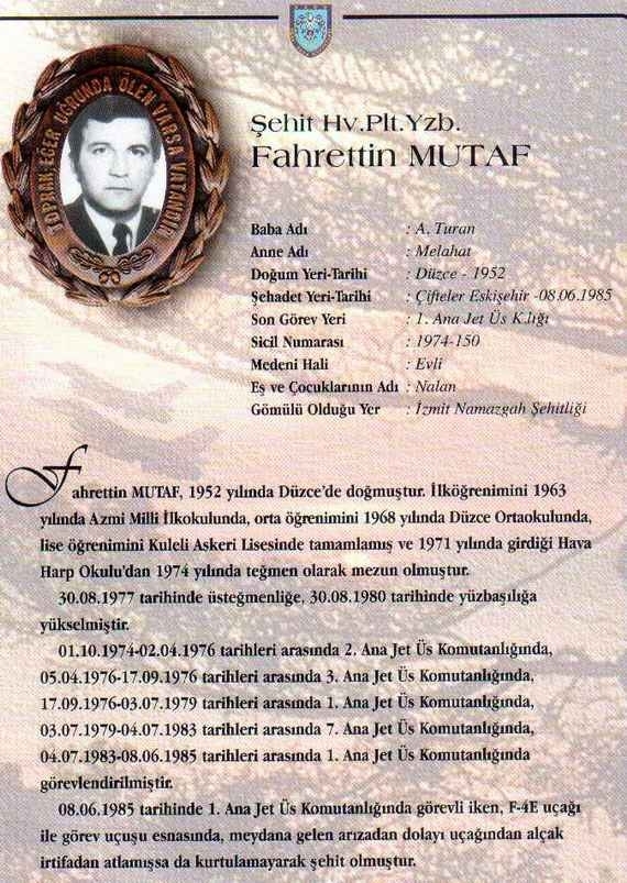 Özgeçmiş: Şehit Hv.Plt.Yzb. Fahrettin Mutaf 1952 yılında Düzce'de doğmuştur. İlköğrenimini 1963 yılında Azmi Milli İlkokulunda, orta öğrenimini 1968 yılında Düzce Ortaokulunda, lise öğrenimini Kuleli Askeri Lisesinde tamamlamış ve 1971 yılında girdiği Hava Harp Okulu'dan 1974 yılında teğmen olarak mezun olmuştur. 30.08.1977 tarihinde üsteğmenlige, 30.08.1980 tarihinde yüzbaşılığa yükselmiştir.