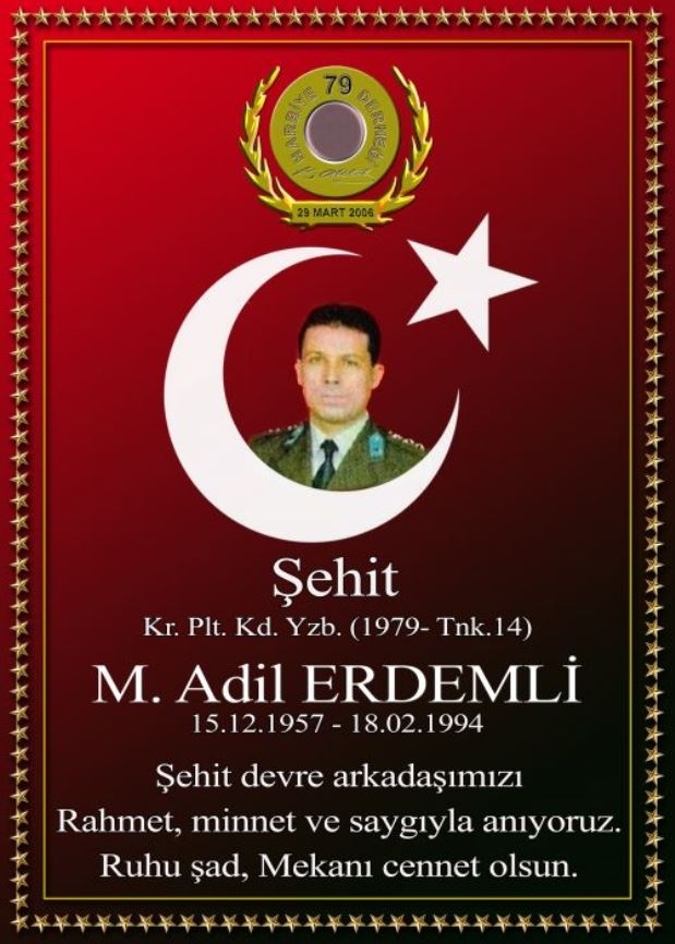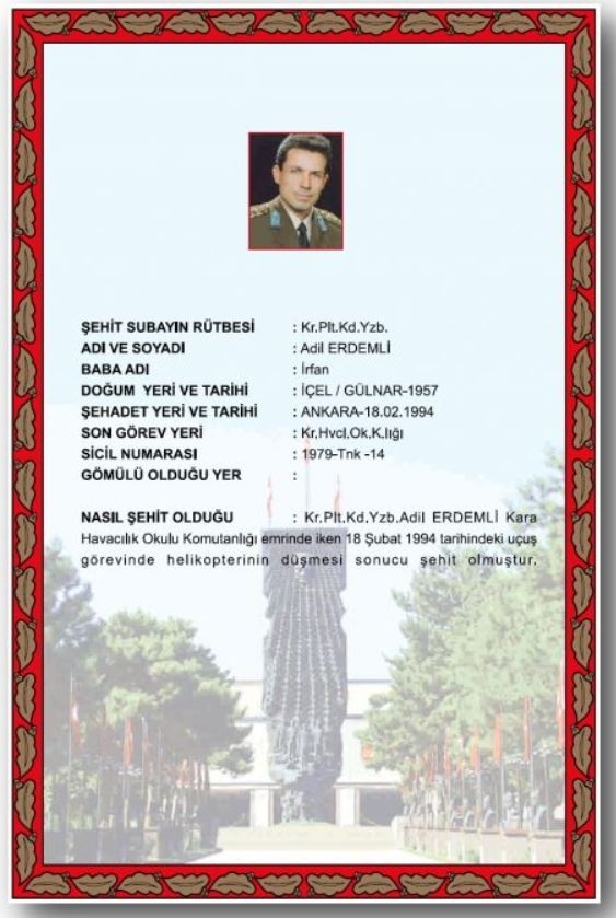 Şehadet Öyküsü: Şehit Kr.Plt.Yzb. Muhammet Adil ERDEMLİ Kara Havacılık Okul Komutanlı emrinde iken 16.02.1994 tarihinde uçuş görevinde ohelikopterinin düşmesi sonucunda şehit olmuştur.