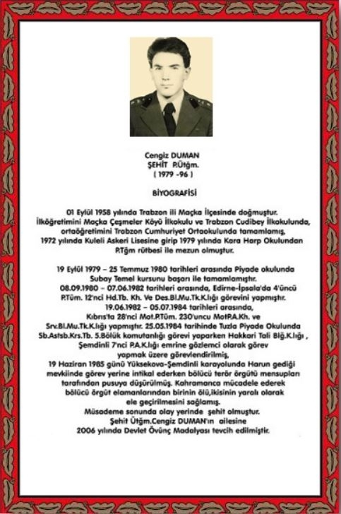Özgeçmiş: Şehit P.Ütğm. Cengiz Duman 01 Eylül 1958 yılında Trabzon ili Maçka İlçesinde doğmuştur. İlköğretimini Maçka Çeşmeler Köyü ilkokulu ve Trabzon Cudibey İlkokulunda, ortaöğretimini Trabzon Cumhuriyet Ortaokulunda tamamlamış.