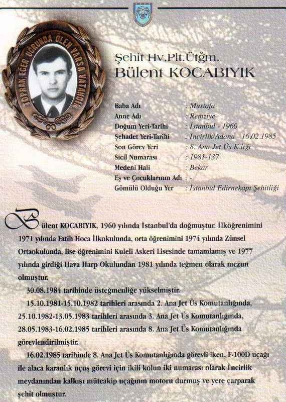 Özgeçmiş: Şehit Hv.Plt.Ütğm. Bülent Kocabıyık 1960 yılında İstanbul'da doğmuştur. İlköğrenimini 1971 yılında Fatih Hoca İlkokulunda, orta öğrenimini 1974 yılında Zünsel Ortaokulunda, lise öğrenimini Kuleli Askeri Lisesinde tamamlamış ve 1977 yılında girdiği Hava Harp Okulundan 1981 yılında teğmen olarak mezun olmuştur. 30.08.1984 tarihinde üsteğmenliğe yükselmiştir.