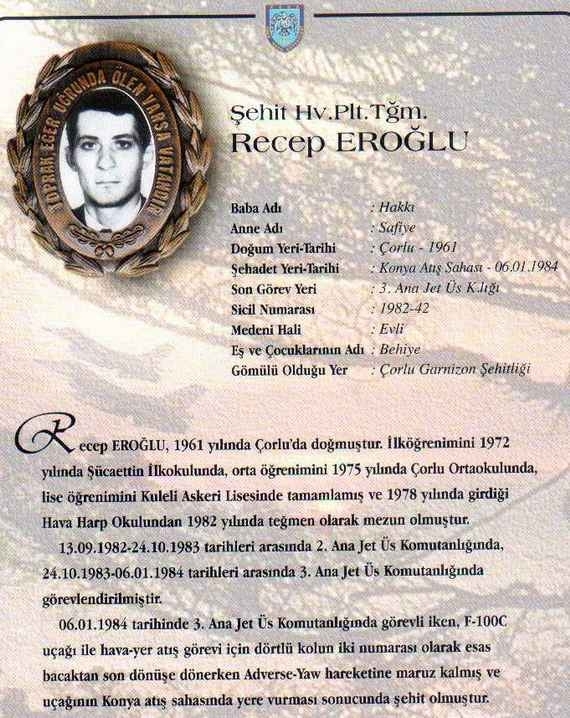 Özgeçmiş: Şehit Hv.Plt.Tğm. Recep Eroğlu 1961 yılında Çorlu'da doğmuştur. İlköğrenimini 1972 yılında Şücaettin İlkokulunda, orta öğrenimini 1975 yılında Çorlu Ortaokulunda, lise öğrenimini Kuleli Askeri Lisesinde tamamlamış ve 1978 yılında girdiği Hava Harp Okulundan 1982 yılında teğmen olarak mezun olmuştur.