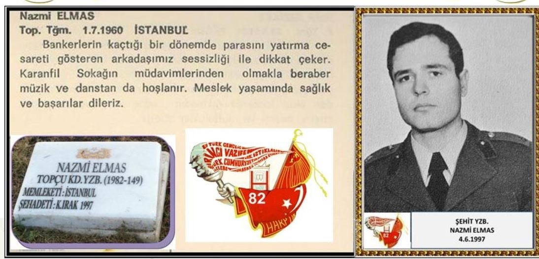 Özgeçmiş: Şehit Top.Yzb. Nazmi Elmas 01.07.1960 tarihinde Ankara’da doğmuştur. 1978 yılında Kuleli Askeri Lisesinden, 1982 yılında Kara Harp okulundan Topçu Teğmen rütbesi ile mezun oldu.