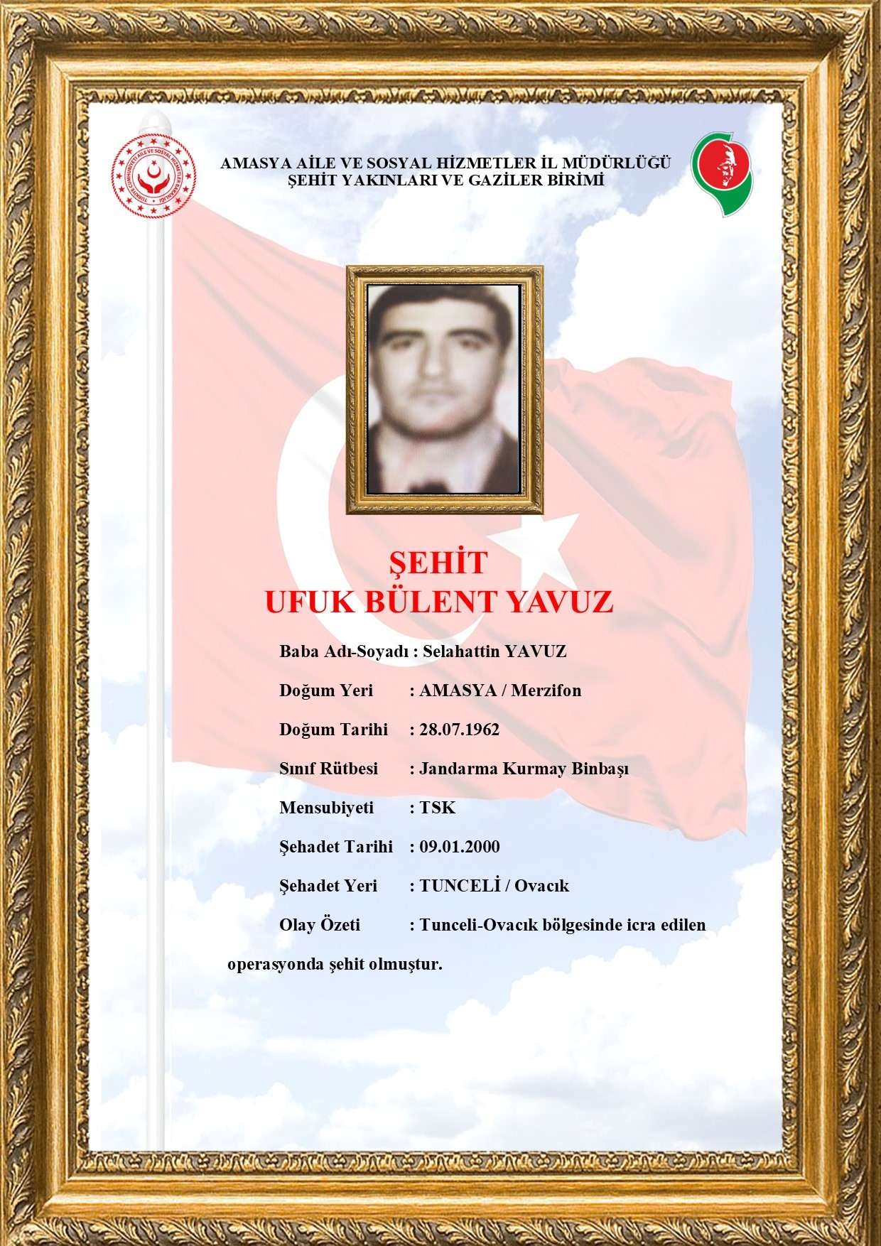 Özgeçmiş: Şehit J.Kur.Bnb. Ufuk Bülent Yavuz 27.07.1962 tarihinde Merzifon'da doğdu. 1980 yılında Kuleli Askeri Lisesinden ve 1984 yılında Kara Harp Okulundan Jandarma Teğmen rütbesi ile mezun oldu.