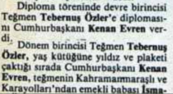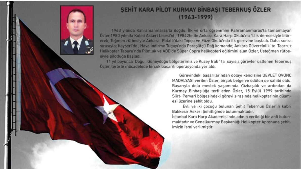 Özgeçmiş: Şehit Kr.Plt.Kur.Bnb. Tebernuş Özler 01.03.1963 tarihinde Kahramanmaraş'ta doğdu. İlk ve orta öğrenimini Kahramanmaraş'ta tamamladı,1980 yılında Kuleli Askeri Lisesinden ve 1984 yılında Kara Harp Okulundan birincilik derecesiyle bitirerek, Topçu Teğmen rütbesiyle Ankara Polatlı'daki Topçu ve Füze Okulu'nda ilk görevine başladı. Daha sonra sırasıyla; Kayseri'de, Hava İndirme Tugayı'nda Paraşütçü Dağ komando; Ankara Güvercinlik' te Taarruz Helikopter Taburu'nda Pilotluk ve ABD'de Süper Copra helikopteri eğitimini alan Özler, Üsteğmen rütbesiyle pilotluğa başladı.Teğmen Rütbesi ile mezun olmuştur.