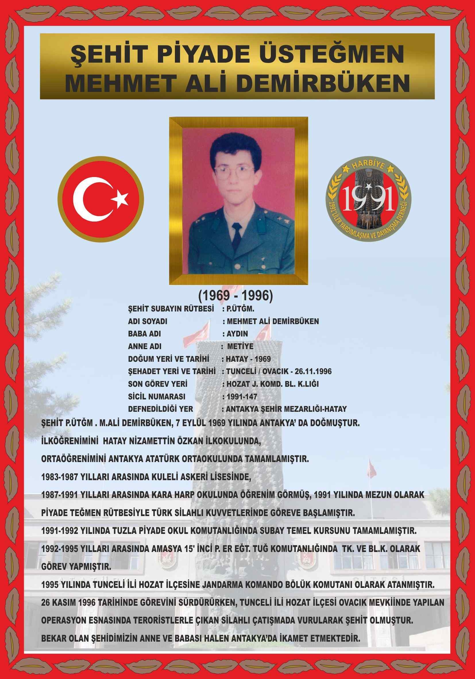 Özgeçmiş: Şehit P.Ütğm. M. Ali Demirbüken 7 eylül 1969 yilinda Antakya' da doğmuştur. İlköğrenimini Hatay Nizamettin Özkan ilkokulunda, ortaöğrenimini Antakya Atatürk ortaokulunda tamamlamiştir.