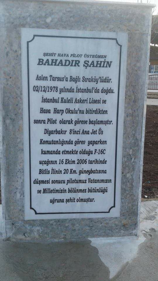 Özgeçmiş: Şehit Hv.Plt.Ütğm. Bahadır Şahin aslen Tarsus'a Bağlı Sıraköy'lüdür. 02/12/1978 yılında İstanbul'da doğdu. lise eğitimini 1996 yılında Kuleli Askeri Lisesinde tamamlayarak, gittiği Hava Harp Okulundan 2000 yılında Teğmen Rütbesi ile mezun olmuştur. 2003 yılında Üsteğmen rütbesine terfi etmiştir.