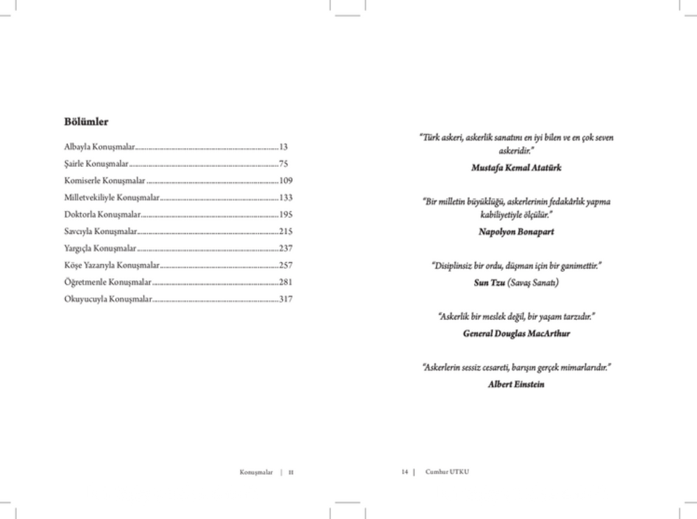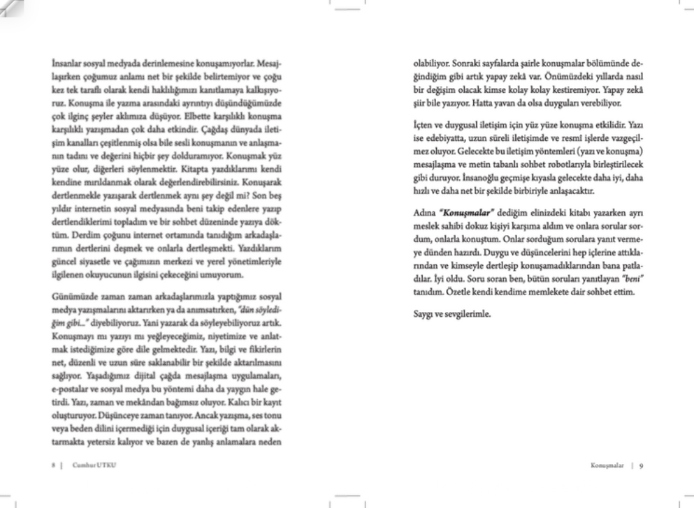 "Konuşmalar" sıradan bir diyaloglar dizisi değil; memleket meselelerini derinlemesine irdeleyen bir düşünce akışı. Cumhur Utku, farklı mesleklerden dokuz kişiyle yaptığı sohbetlerde, Türkiye'nin toplumsal, siyasal ve kültürel dönüşümünü sorgularken, okuyucuyu da kendi yolculuğuna ortak ediyor.
